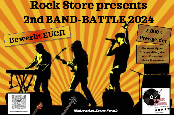 Der Rock Store ruft zum zweiten Mal alle talentierten und leidenschaftlichen Musikbands dazu auf, sich für den heiß erwarteten Band Battle 2024 zu bewerben! Nach dem überwältigenden Erfolg des letzten Wettbewerbs freuen wir uns darauf, erneut die besten Bands der Region aus verschiedenen Genres auf unserer Bühne zu begrüßen.