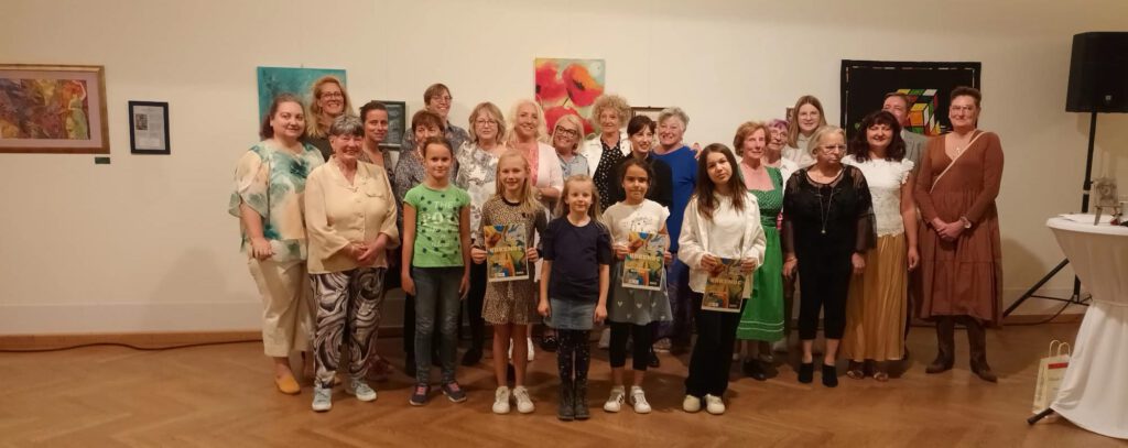 Im ersten Jahr seit Herbst 2022 haben schon insgesamt 36 Kunstschaffende im Foyer des Rathauses ausgestellt. Nicht dort, sondern im Unterbräusaal feierten sie am 11. Oktober 2023 das einjährige Jubiläum – damit die vielen Gäste und Bilder überhaupt genügend Platz fanden. Alexander Dutov begleitete die Feier am Klavier, „Markt Schwabens zweitgrößte Brauerei“ Luisbräu versorgte die Gäste, der Non-Profit-Schallplattenladen ROCK STORE unterstützte den Ausstellungsabend finanziell.