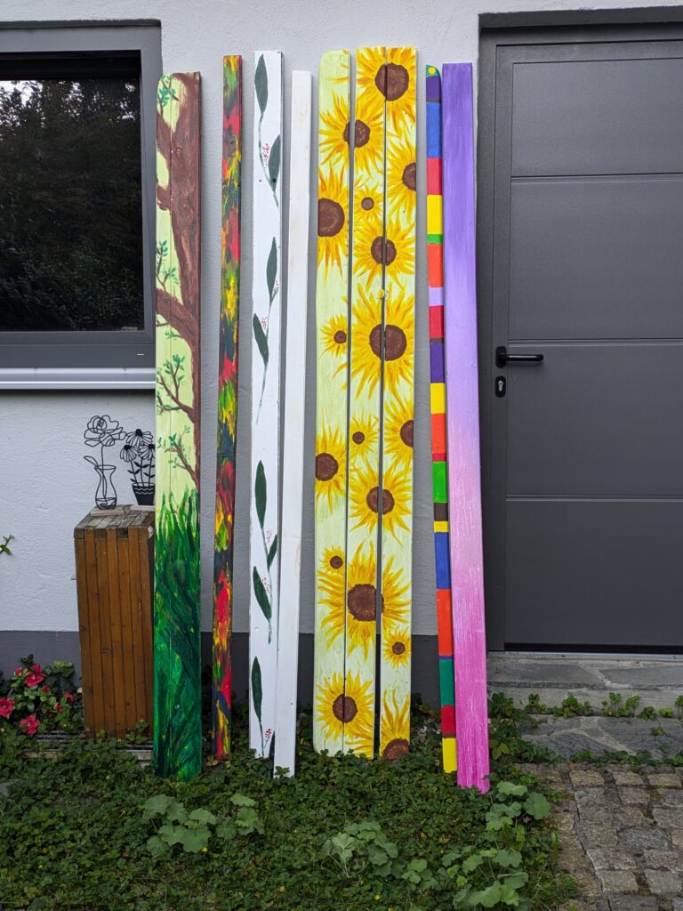 Eine alte Biertischgarnitur war sehr verwittert und zum eigentlichen Gebrauch nicht mehr zu verwenden. Die Metallteile wurden abgeschraubt und die Bretter kurzerhand einzeln bemalt und dienen jetzt als einzigartige, bunte Gartendeko